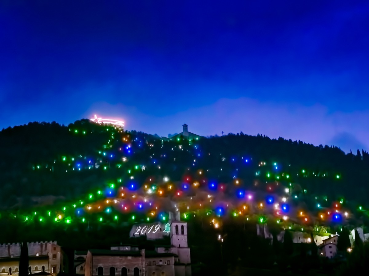 Affacciata sul Monte Ingino, durante le festività Gubbio diventa teatro di un’opera luminosa in grado di trasformare l’inverno in un itinerario emozionale, grazie all’impegno di un gruppo di volontari che da ben 45 anni porta avanti un progetto unico nel suo genere.