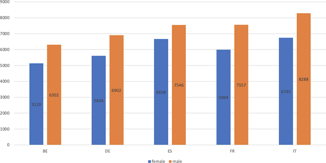 Indipendentemente dal paese di appartenenza, sembra inoltre che gli uomini camminino in media più delle donne. Le donne italiane sembrano molto meno propense a camminare rispetto agli uomini: camminano in media 1.540 passi in meno rispetto alla controparte maschile.