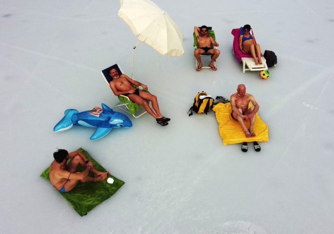 Il Tuffo della Merla in Val di Ledro salta, ma ci si fa beffe del virus con ombrellone e sdraio sul ghiaccio, come se fosse una spiaggia di mare, ma sempre nel consono ambiente di fine gennaio con temperature gelide e freddo birichino.