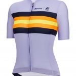 Per il completo donna firmato Santini ǀ K-Way la scelta cromatica è caduta sul lilla, uno dei colori trend della stagione SS23. La maglia è realizzata in tessuti eco-friendly, cioè 100% con filati riciclati che provengono da PET e filati di scarto, e presenta gli iconici colori K-Way, blu, arancio e giallo, nelle righe orizzontali posizionate centralmente. Il fit scelto dai designer è sleek, per una vestibilità molto aderente; le maniche e il collo sono tagliati al vivo, e la zip centrale è coperta.