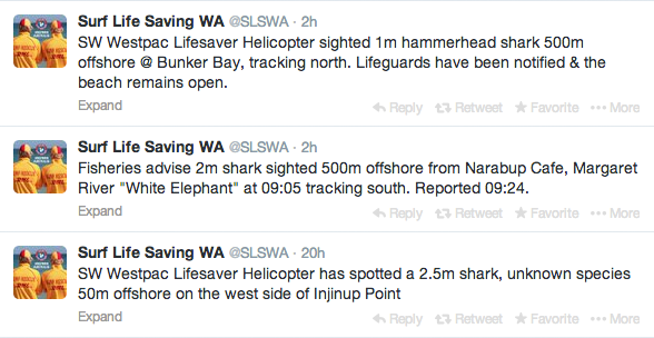 Se state progettando di andare a surfare in Western Australia, cominciate a seguire questo account Twitter: @SLSWA. L’account è dell’organizzazione Surf Life Saving Western Australia e potrebbe salvarvi la pelle, soprattutto dall’attacco di uno squalo.