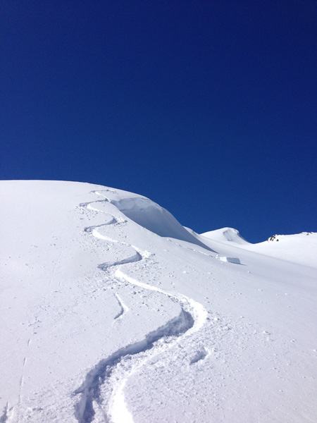 Una volta nel vallone, terminato il tratto più ripido e potenzialmente più pericoloso, possiamo rilassarci lasciando scivolare gli sci sulla soffice neve e sul pendio, sostenuto e costante, che garantisce una sciata ottimale.