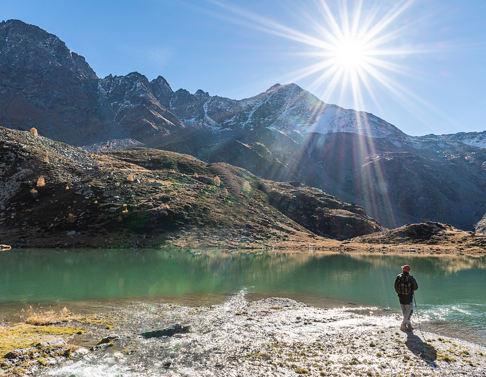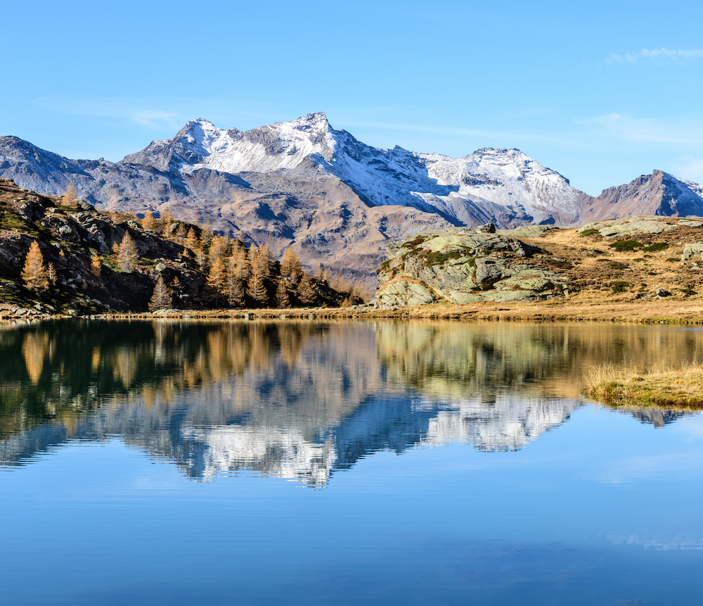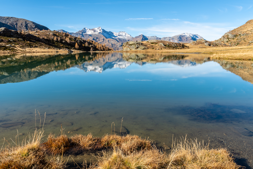 Il lago è una piccola meraviglia naturale: specchia perfettamente il Pizzo Stella (3.163 m), la montagna simbolo della valle, e nei giorni limpidi d’autunno regala panorami di straordinaria nitidezza.