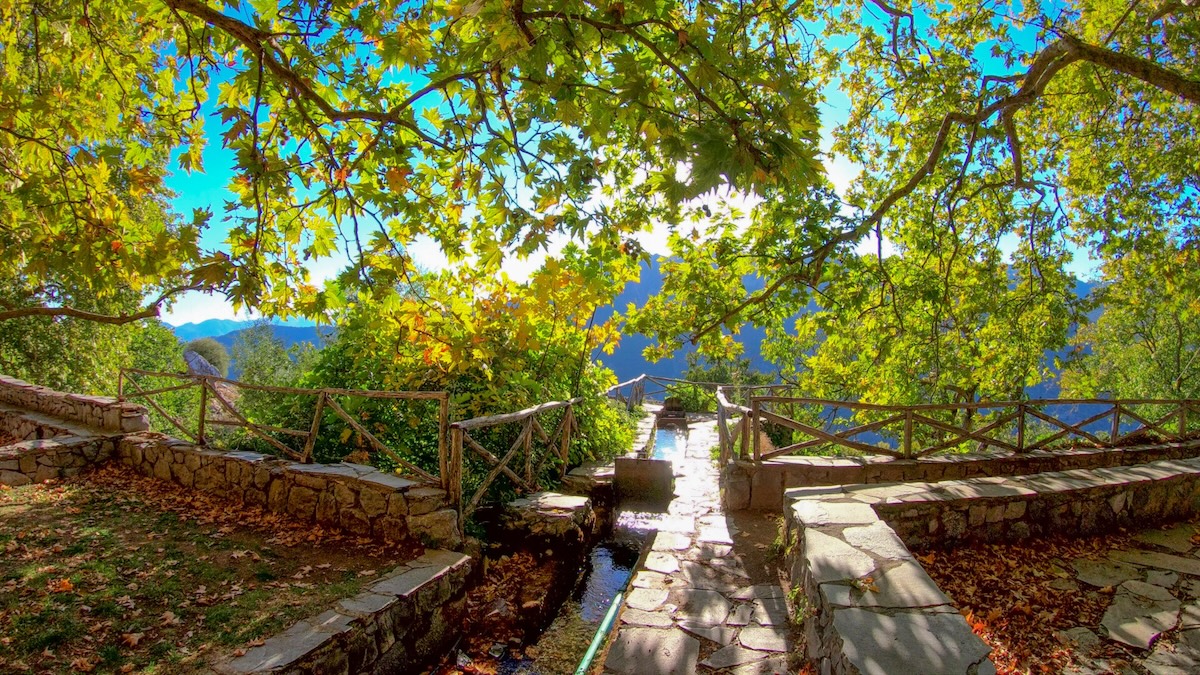 La tappa più bella e più famosa è la prima: Stemnitsa–Dimitsana, 12,5 chilometri con 746 metri di dislivello, circa 5 ore di cammino. Si scende nella gola, si passa davanti ai monasteri di Prodromos e Filosofou, si risale verso Dimitsana attraverso boschi di abeti e panorami sulla valle. È una delle giornate di trekking più complete che si possano fare in Grecia: storia, natura, architettura, silenzio.