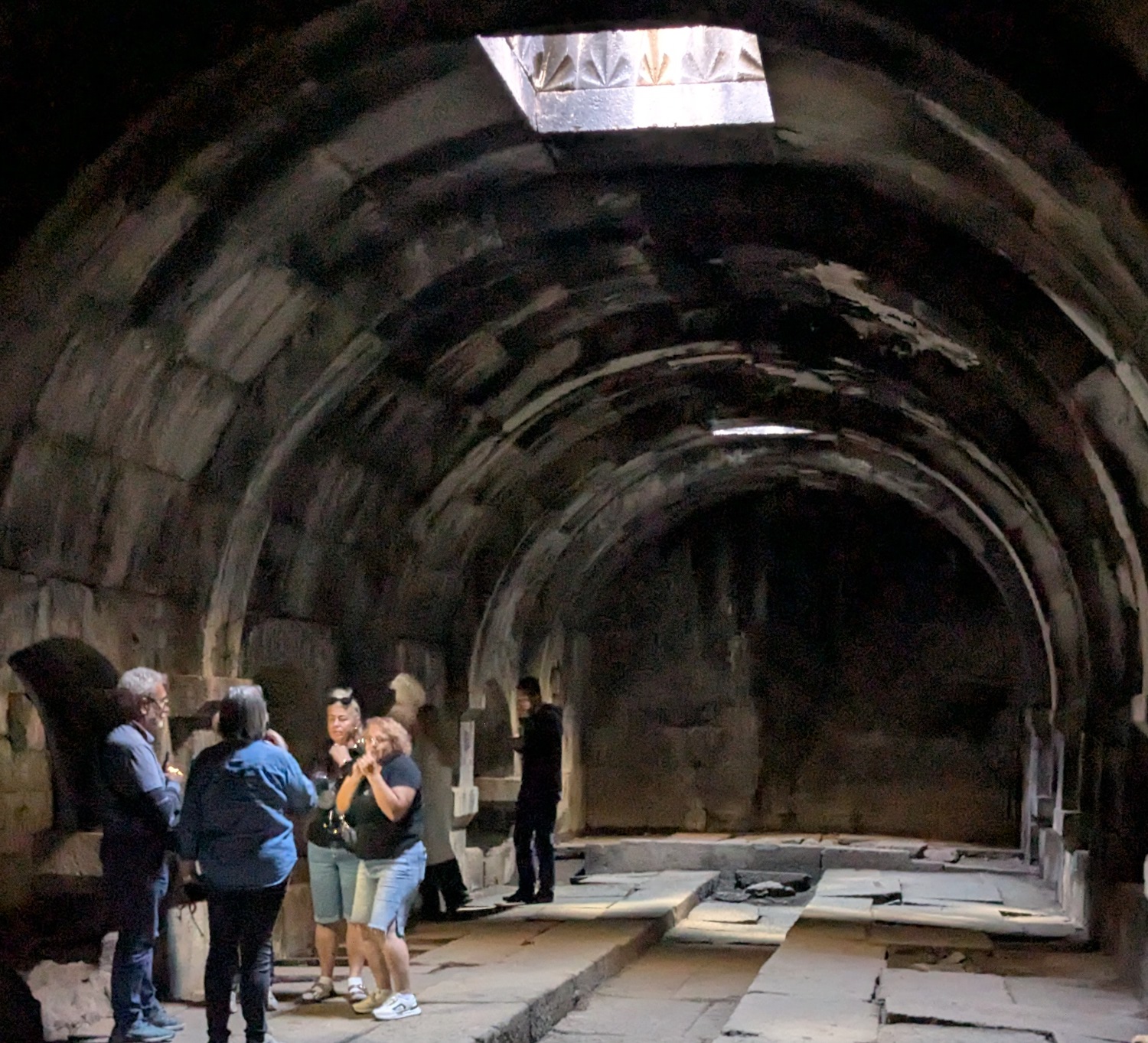 All’interno del caravanserraglio, la luce filtra da piccole fessure nel tetto e disegna cerchi dorati sulle pareti di basalto. L’aria è fresca, densa di memoria. Ogni pietra sembra raccontare una storia di passaggi antichi: mercanti persiani, pellegrini armeni, carovanieri venuti da Samarcanda.