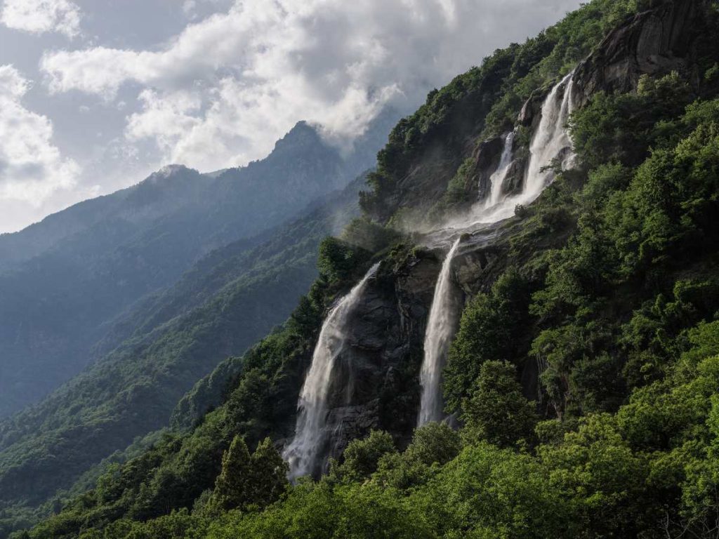 All’Acquafraggia si può udire l’acqua prima di vederla. Un mormorio profondo, poi un ruggito breve e poi di nuovo quiete. L’aria vibra e porta goccioline leggere fino ai prati attorno. La valle di Piuro resta sullo sfondo, con le case di pietra e la montagna che sale verticale. Le cascate scendono in più salti e arrivano in fondo come nastri bianchi che brillano sulla roccia scura. L’acqua si frantuma a metà discesa, crea ventagli e ritorna subito in mille rivoli. Attorno ci sono prati verdi, muretti in pietra, sentieri che avanzano verso quote più alte. Il salto principale misura circa 170 metri, un muro d’acqua che riempie l’aria e lascia una scia di freschezza sulla pelle.