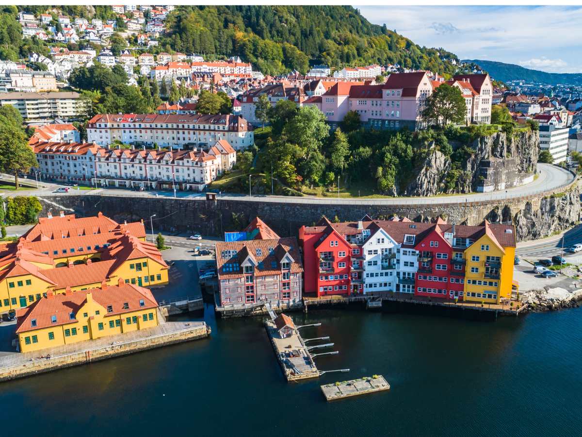 Bergen vive raccolta in un vero e proprio anfiteatro naturale formato da sette montagne. Questi rilievi la circondano quasi completamente, creando una sorta di conca verde e rocciosa che condiziona clima, luce e persino la struttura dei quartieri. Le strade salgono e scendono seguendo la forma del terreno, i tetti sembrano arrampicarsi sui pendii e basta spostarsi di poche centinaia di metri per trovarsi già in alto, con viste ampie sui fiordi.