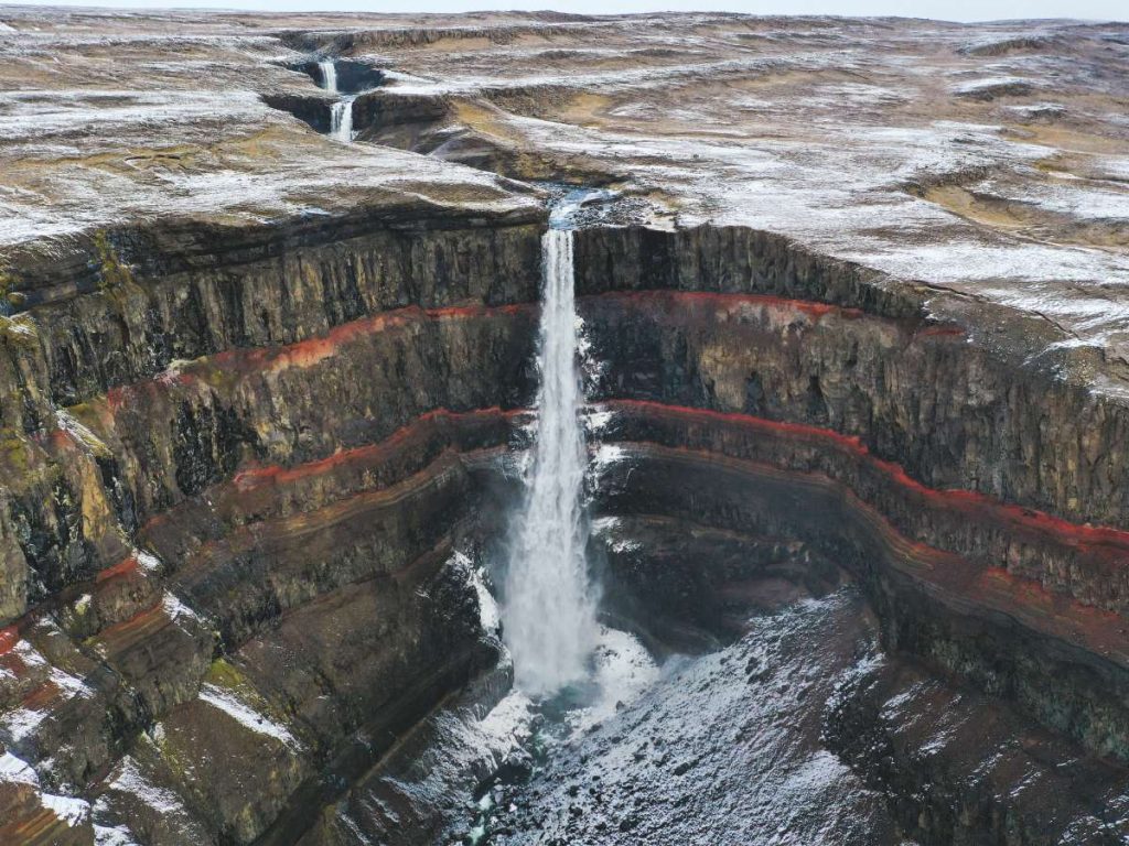 La cascata Hengifoss si staglia alta e stretta tra colonne basaltiche rossastre, che creano un effetto quasi tagliente sulla montagna. Il percorso per raggiungerla, anche d’inverno, è fattibile: ci sono tratti ghiacciati e neve, ma non richiede tragitti estremi (se non una buona attenzione). Intorno l’altopiano si presenta spoglio e i fiumi glaciali fanno sì che il paesaggio risulti austero e isolato.