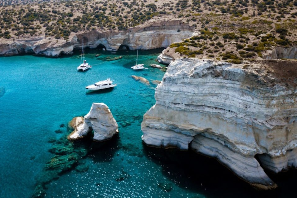 Milos è vulcanica e geologicamente spettacolare — le rocce bianche di Sarakiniko, le sorgenti termali sottomarine di Paleochori dove il fondo del mare è caldo — e ha quel carattere da isola che si guadagna, con calette raggiungibili solo a piedi o in barca.