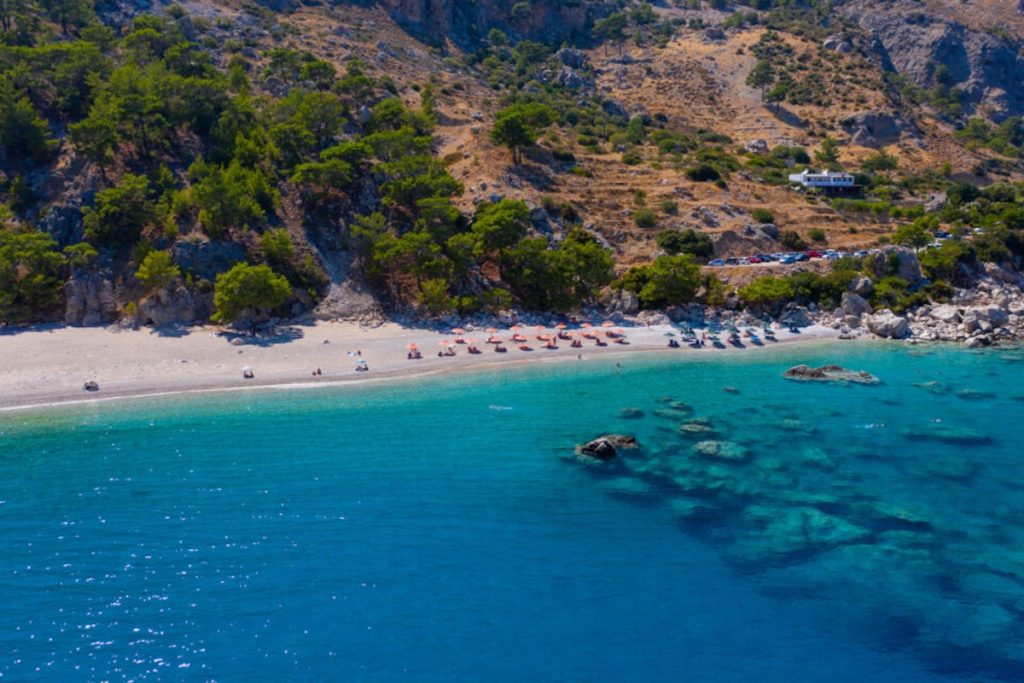 Apella è considerata una delle più belle della Grecia. Acqua turchese, fondali trasparenti e una baia incastonata tra le montagne.