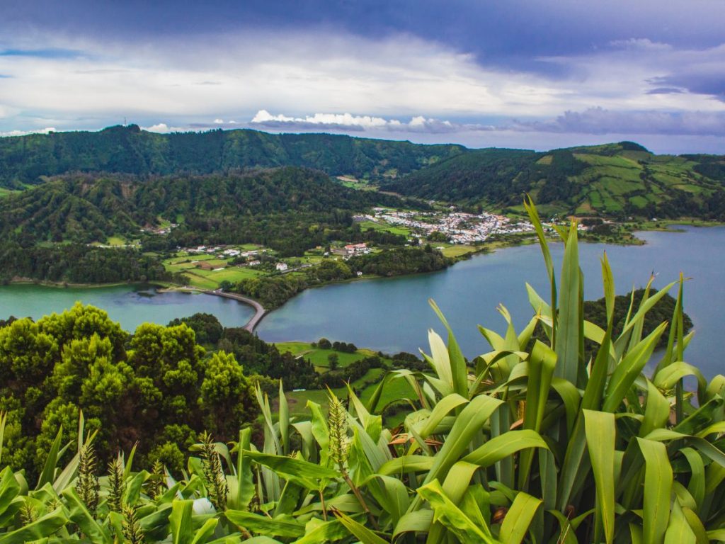 LAGOA DAS SETE CIDADES — Due gemelli d'acqua che riposano in un’enorme caldera vulcanica, brillando di tonalità smeraldo e zaffiro mentre le nebbie invernali delle Azzorre scivolano lungo i bordi verdi del cratere.