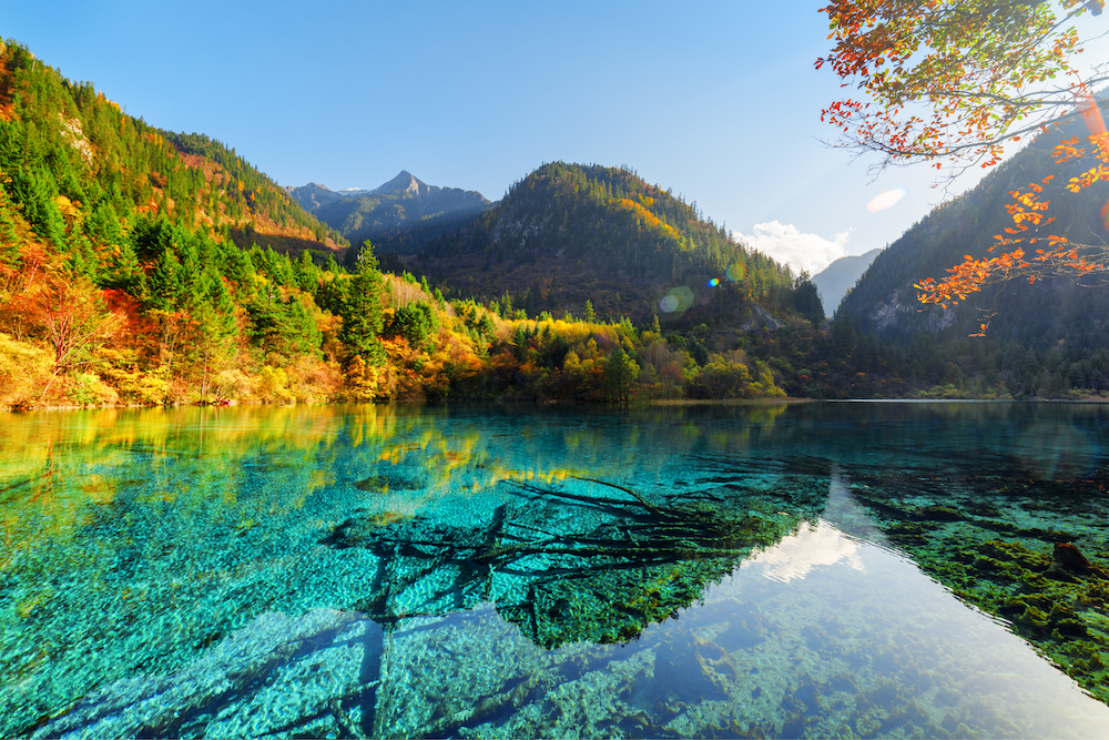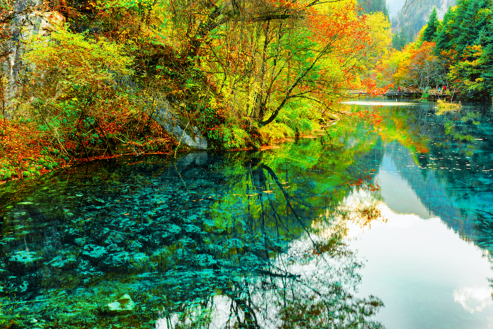 Il Five Flower Lake non colpisce solo per i suoi colori. È famoso anche per l’acqua straordinariamente trasparente, tra le più limpide al mondo: la forte mineralizzazione la rende quasi cristallo liquido. Guardando dentro, il fondale appare nitidissimo anche a diversi metri di profondità, senza la minima distorsione.