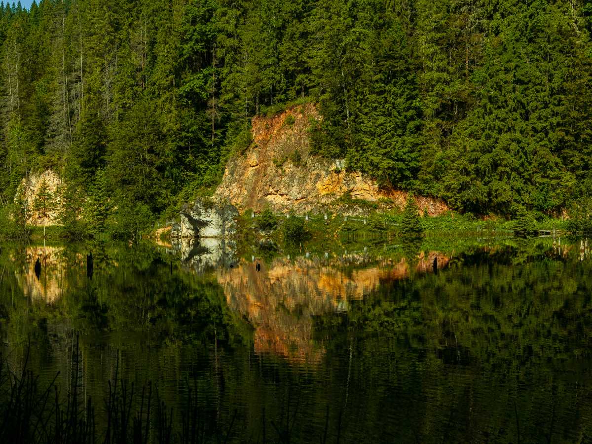 Si creò perciò uno sbarramento naturale che, a sua volta, diede vita a un invaso d’acqua dolce caratterizzato da una particolarità visiva che colpisce immediatamente l’osservatore: una distesa di tronchi d’albero pietrificati emergono dalla superficie liquida. Sono i resti di un’antica foresta di abeti rossi che resistono alla decomposizione grazie alla ricchezza di sali minerali e sedimenti ferrosi, conferendo allo specchio d’acqua un aspetto simile a un cimitero naturale di alberi giganti.