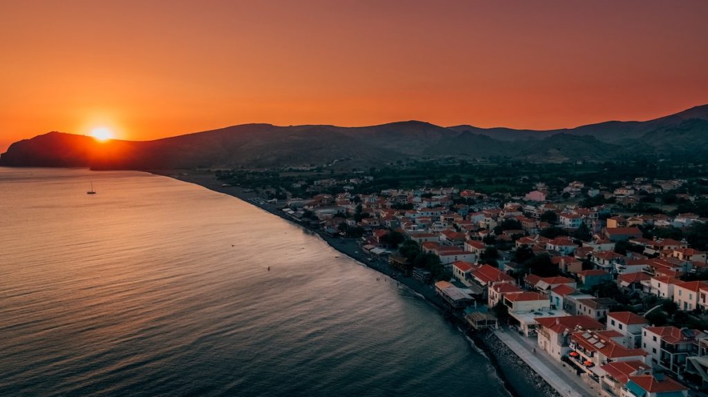 Lesbo non è un’isola da spiaggia nel senso delle Cicladi — ma le spiagge ci sono, e alcune sono eccezionali. Skala Eressos ha tre chilometri di sabbia vulcanica scura, con un lungomare di taverne su palafitte e tramonti sull’Egeo che cambiano colore ogni sera.