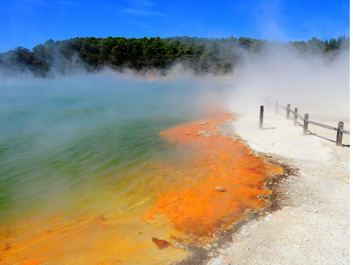 • Champagne Pool: una depressione profonda 62 metri che è il frutto di un’eruzione di 700 anni fa. Il nome deriva dalle bollicine di anidride carbonica che risalgono in superficie, ma attenzione, perché il bordo arancione intenso non è decorativo. È un deposito solido di arsenico e antimonio che si accumula dove l’acqua calda incontra l’aria e si raffredda leggermente.