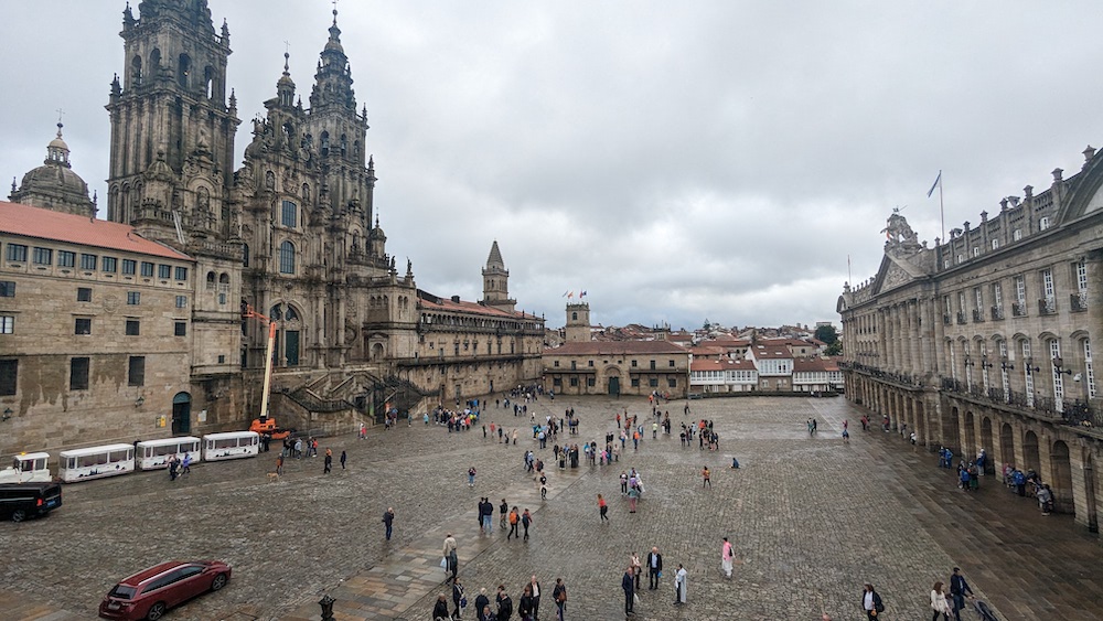La Praza do Obradoiro è uno dei luoghi più ‘forti’ d’Europa. Più della cattedrale, più della città. È la distesa di pietra dove finisce il Cammino, qualunque Cammino: a piedi, in bici, da soli, in gruppo, dopo una settimana o dopo un mese.