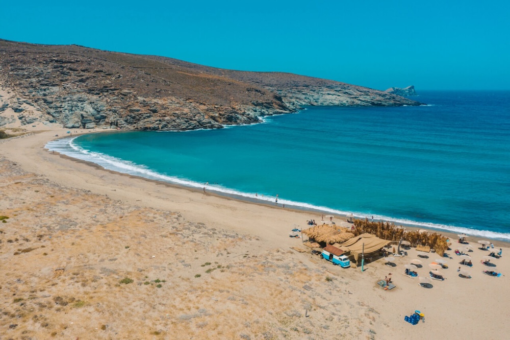 Siamo nelle Cicladi, tra Mykonos e Andros, ma l’atmosfera cambia radicalmente: niente beach club affollati, niente file per una foto al tramonto. Qui il paesaggio è aspro, le colline sono punteggiate di muretti a secco e villaggi bianchi, il meltemi soffia forte e le spiagge restano autentiche.