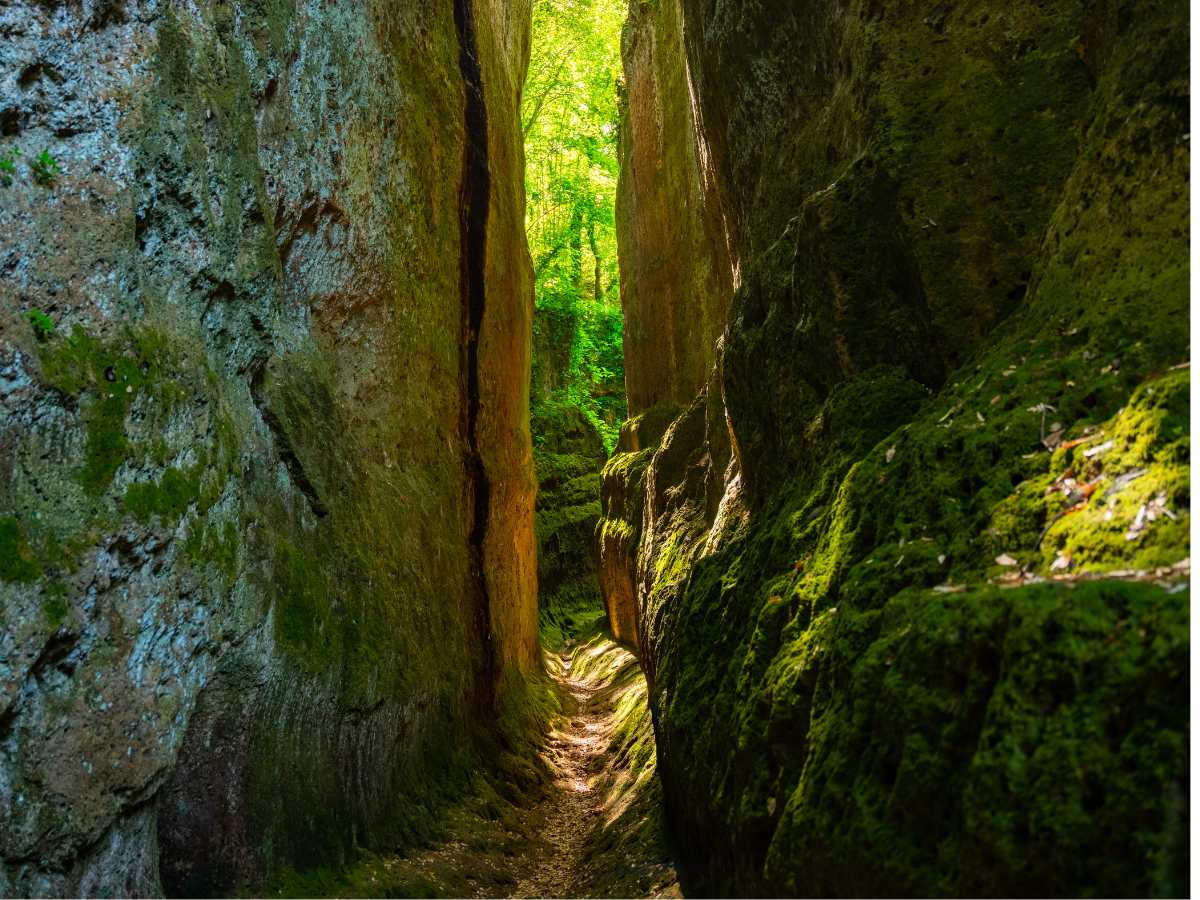 Con il passare degli anni, le Vie Cave continuarono a essere utilizzate anche dai Romani che, comprendendone unicità e importanza, le collegarono alla via Clodia, strada cruciale che univa Roma a Saturnia e Tuscania. Oggi questi antichi passaggi intrecciano storia, natura e geologia: le pareti umide accolgono felci come lo Scolopendrium Vulgare e l’Adiantum Capillus Veneris, mentre muschi, licheni ed edere contribuiscono a un microclima straordinariamente ricco.