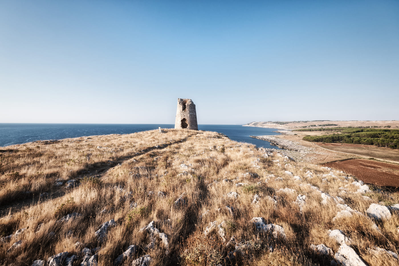 Da Lecce a Santa Maria di Leuca, la Via del Mare del Cammino del Salento è un percorso di centoquindici chilometri suddivisi in sei tappe, su misura per chi ha una settimana da dedicare a questa esperienza a piedi. La prima tappa con destinazione San Foca porta già alla costa adriatica, e da lì il tracciato si mantiene sostanzialmente vista mare, snodandosi principalmente lungo sentieri a mezza costa, tra torri costiere, piscine naturali, grotte e piccole baie, ma anche passaggi sulla spiaggia o tra le pinete di pini di Aleppo. L’itinerario si conclude a Santa Maria di Leuca, all’estremità sud orientale della penisola italiana, salendo i 284 gradini del Santuario de Finibus Terrae, cioè il limite ultimo della terra abitata per i cives romani.