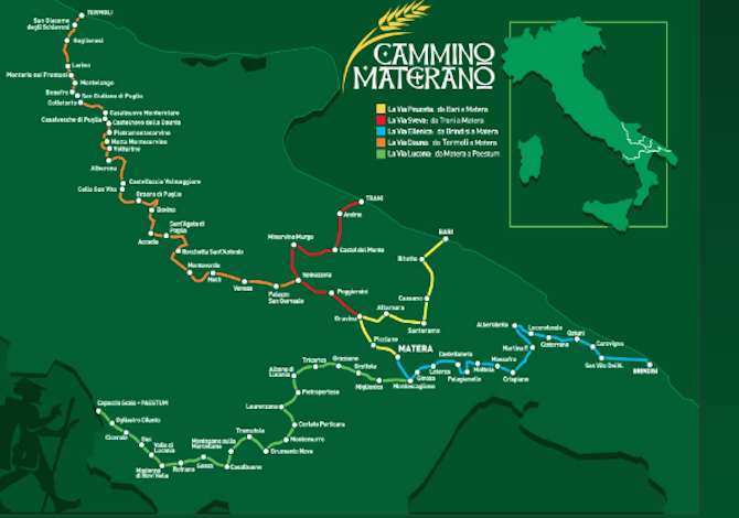 Oggi il Cammino Materano è riconosciuto nell’Atlante dei Cammini del Ministero dei Beni Culturali e prevede cinque diverse vie, in corrispondenza dei punti di partenza, ovvero: