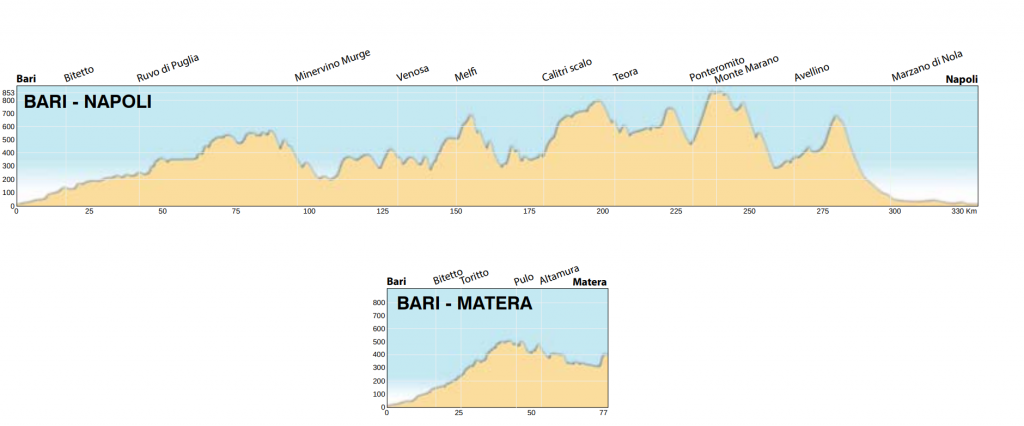 La Bari – Napoli in bicicletta infatti non è un itinerario consigliato a chi affronta la prima vacanza in bicicletta e ha poca abitudine se non allenamento a pedalare un giorno dopo l’altro: c’è un certo dislivello da superare, tappe caratterizzate da parecchi saliscendi collinari che possono risultare impegnative, e appunto altre che invece possono risultare poco piacevoli perché dominate dal traffico veicolare urbano e suburbano.