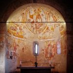 Giusto il tempo di scendere alla stazione di Novara e subito si parte, molti sono gli appuntamenti della giornata. E per ben cominciare, prima tappa alla chiesa di san Leonardo di Borgomanero, proprio dove la Via del Mare interseca la Pedemontana. La gentile guida ci attende sull’uscio e apre le porte di questo gioiello romanico, prima metà del XII secolo, a cui probabilmente si deve il primitivo nome dell’abitato, documentato come Burgus Sancti Leonardi. Un’unica navata, un semplice altare e interni tutt’altro che sfarzosi: la composta sobrietà permette di apprezzare ancor di più la luce che mette in risalto gli affreschi alle pareti. Accanto al Cristo Pantocratore, a Evangelisti e ad Apostoli, ricorre e spicca una misteriosa figura di difficile identificazione, che alcuni riconducono ad un racconto alternativo – e curiosamente poco ortodosso – della vita di Giuda Iscariota.