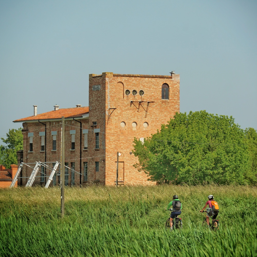 Ci lasciamo presto alle spalle Lignano, cittadina balneare, per trovarci catapultati nelle terre della bonifica: strade bianche e assolate sotto il livello del mare, strappate agli acquitrini proprio durante il ventennio delle “cose buone”. Impressionante arrivare pedalando ai piedi delle macchine idrovore, solenni cattedrali di mattoni erette con l’unico scopo di risucchiare acque dalle terre sommerse per gettarle nel mare. Operosi generali, mostrano come medaglie gli stemmi di pietra di questi territori: targhe a ricordo di ingegneri, date di costruzione e di rinnovo, leoni alati per non dimenticare che qui un tempo era tutta Venezia.