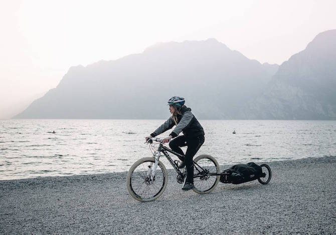 Il gadget si adatta alle bici con ruote da 26 a 29 pollici, contiene 70 litri e 20 kg di peso ed è impermeabile. La ruotina posteriore che si estrae dallo zaino è da 16” e si monta facilmente tramite la struttura del trolley, per poi venire attaccata alla ruota posteriore della bici.