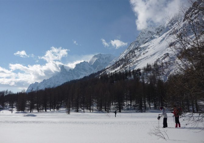 Il paradiso del fondo è la Val Ferret: neve da novembre a maggio, 20 km di piste sotto il Monte Bianco, con il Dente del Gigante, il Grand Jorasses e le Aiguille sullo sfondo, e le foreste di abeti che si snodano lungo la Dora Ferret.
