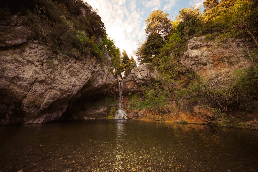 Alle spalle scende un torrente con cascate e laghetti naturali — si fa il bagno nell’acqua dolce tra idromassaggi naturali e viste sull’Egeo.