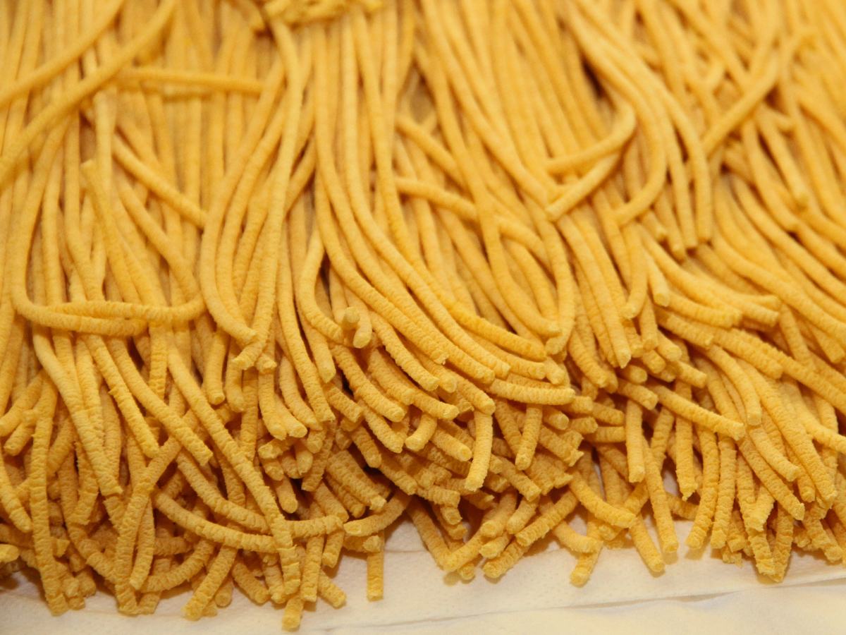 A differenza della pasta stesa al mattarello, infatti, il Bigolo nasce per pressione. L’impasto, estremamente sodo e con pochissima umidità (il più delle volte solo farina di grano tenero, acqua e un pizzico di sale, o uova d’anatra nelle versioni più ricche), viene spinto attraverso una trafila di bronzo. Grazie a questo meccanismo emerge la forma di uno spaghettone (che raggiunge i 3mm di diametro), ma contemporaneamente si lacera microscopicamente la superficie.