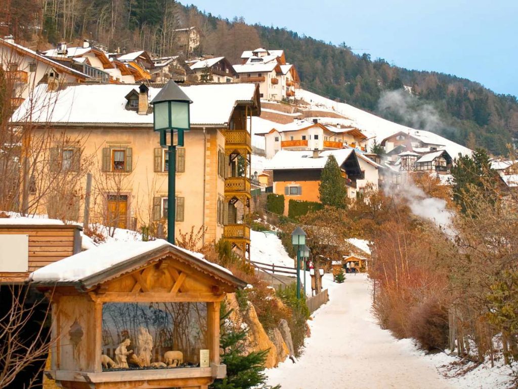Capitale della Val Gardena, Ortisei è il borgo dove la maestria artigianale incontra il paesaggio dolomitico più iconico. Celebre in tutto il mondo per l’arte dell’intaglio del legno, il suo centro storico si trasforma in un salotto di luci e architetture tipiche tirolesi, con le facciate decorate che risaltano contro il bianco delle cime del Seceda e dell’Alpe di Siusi.