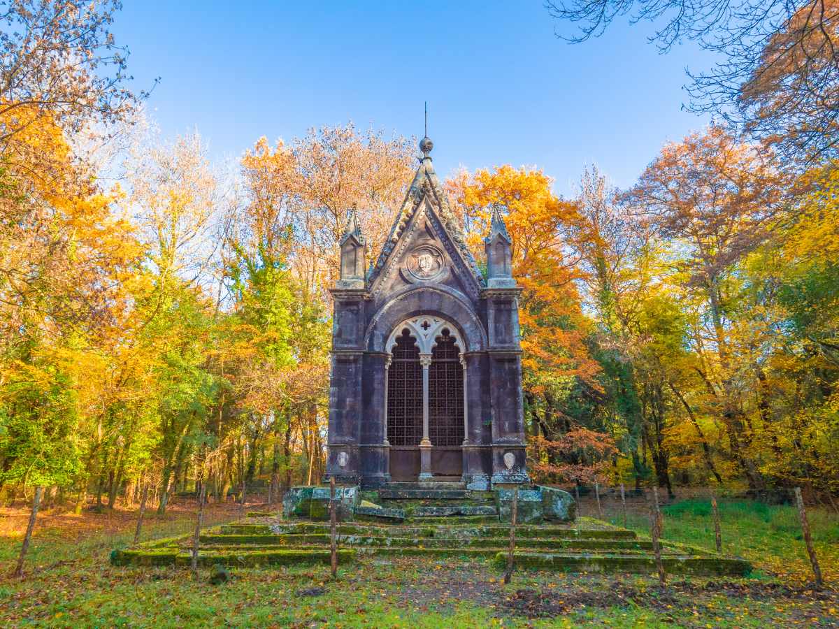 L’intervento umano è oggi quasi invisibile, mimetizzato da decenni di crescita botanica spontanea. L’unico edificio che rompe l’uniformità verde è il mausoleo neogotico, una piccola struttura funebre voluta dal marchese stesso. Tale costruzione, avvolta dai rami, accoglie le spoglie del proprietario dal 1894 e rappresenta il cuore spirituale dell’area. La simbiosi tra le opere in pietra e le radici aeree degli alberi veterani conferisce al paesaggio un carattere solenne (per molti quasi sacro).