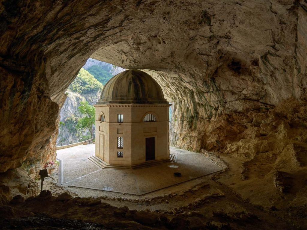 Costruito interamente in travertino all’interno della bocca di una grotta, l’ottagonale Tempio del Valadier è l’icona dell’outdoor ipogeo nella Gola di Frasassi. La salita a piedi lungo il sentiero lastricato è una progressione verso il buio della montagna, interrotta dalla luminosità abbacinante della chiesa che pare quasi voler sostenere la volta rocciosa sopra di sé.