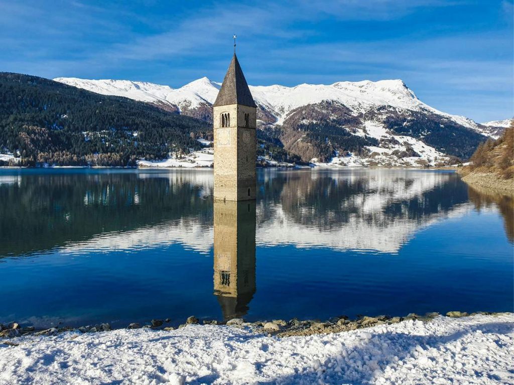 KAYAK SUL LAGO DI RESIA - Pagaiare tra i frammenti di ghiaccio che galleggiano sulla superficie lacustre consente di accostarsi al celebre campanile trecentesco da una prospettiva privilegiata e silenziosa, immersi in uno scenario alpino dall'estetica quasi spettrale.