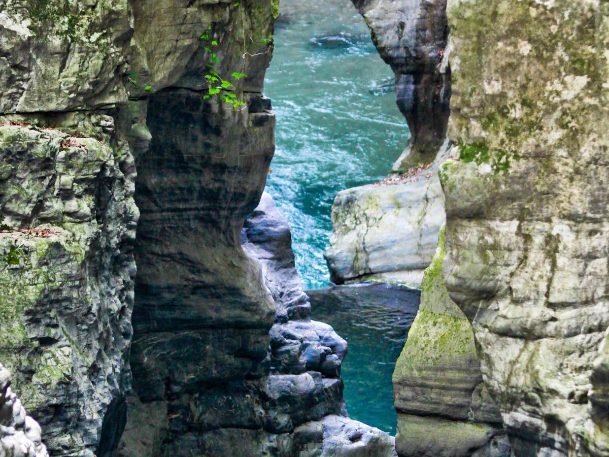 Andando verso il fondo della valle, il clima muta sensibilmente diventando fresco e umido. Una scaletta scavata nella roccia conduce alla maestosa entrata della cavità, profonda circa 550 metri, battezzata ufficialmente Grotta della Risorgenza. All’interno, il rumore del fiume che torna alla luce domina l’ambiente, mentre passerelle e ponticelli in legno permettono di osservare da vicino le pareti modellate dalla forza idrica costante.