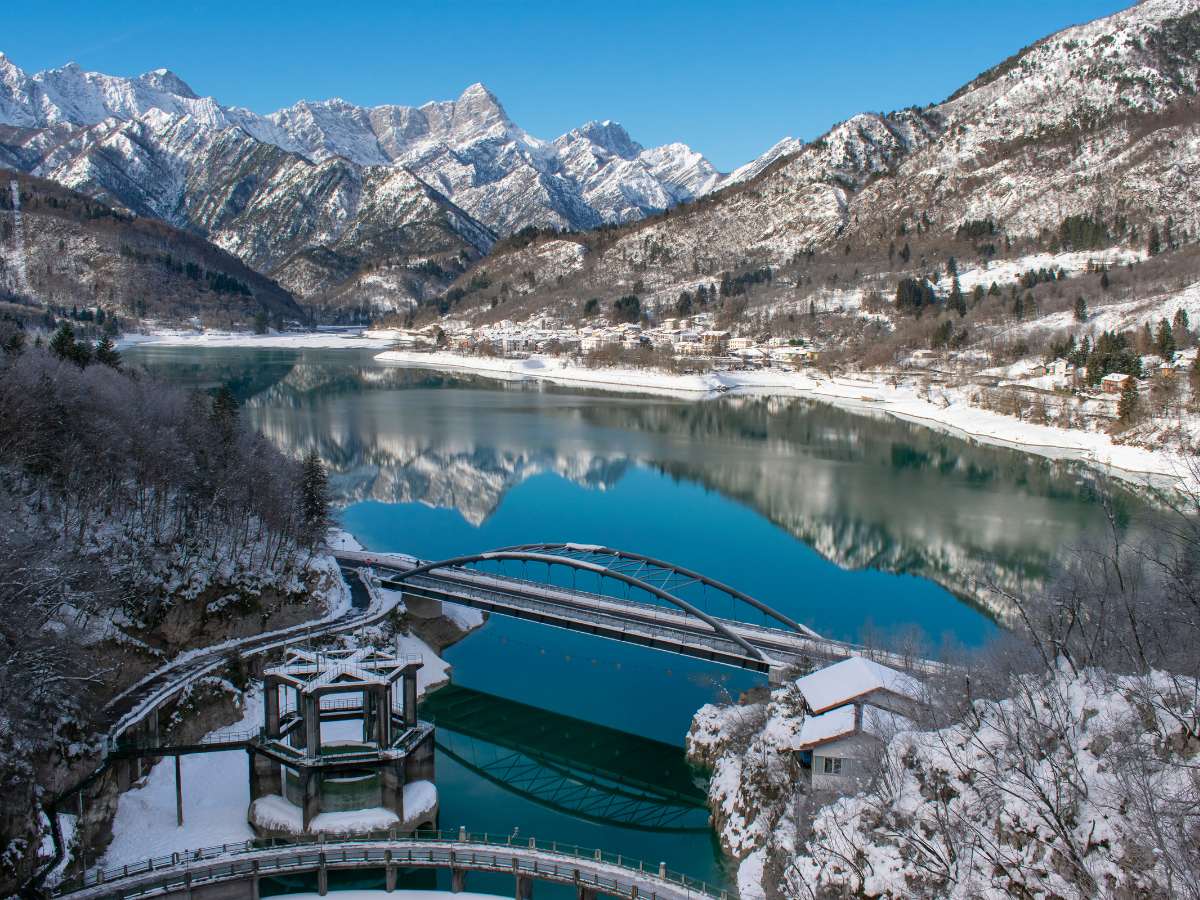 Nonostante la quota relativamente bassa (402 metri), il Lago di Barcis in inverno regala uno spettacolo cromatico unico grazie alla limpidezza delle acque fredde. Raramente si ghiaccia completamente a causa della corrente del torrente Cellina, ma le temperature rigide della Valcellina creano cristalli di ghiaccio lungo le sponde rocciose e sulle passerelle del “Sentiero del Dint”, che mette a disposizione punti panoramici tecnici sulle formazioni carsiche circostanti.