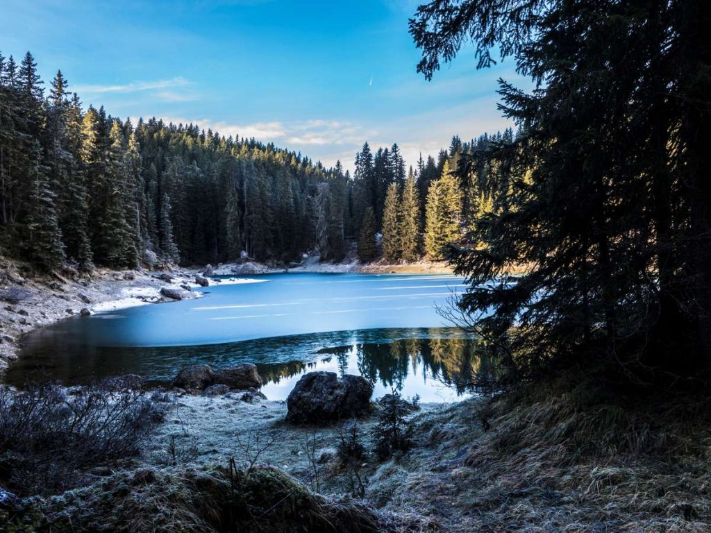 Conosciuto come “Lec de Ergobando” (lago dell’arcobaleno), a 1.520 metri, in inverno può ridursi drasticamente di volume, lasciando intravedere le formazioni rocciose del fondale sotto una crosta di ghiaccio trasparente. Le foreste di abeti rossi circostanti (il famoso “legno di risonanza”) danno vita a un perimetro di protezione dal vento, favorendo una cristallizzazione del ghiaccio molto regolare e uniforme.