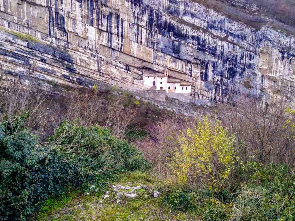 Una piccola chiesa incastonata in una parete verticale di roccia, come se fosse stata scolpita direttamente nella montagna. Per raggiungere l’Eremo di San Colombano c’è una scalinata scavata nella pietra, sotto il vuoto e sopra la roccia che incombe. In autunno la valle si riempie di nebbia, i colori si smorzano e la struttura appare sospesa, quasi appesa al nulla. È una scena assurda, da racconto fantastico.
