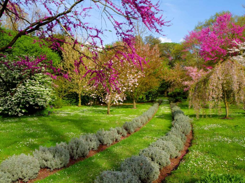 Sulle rovine di una città medievale distrutta nel XIV secolo, la famiglia Caetani ha creato un parco dove la vegetazione inglese si fonde con le strutture storiche. Il fiume Ninfa scorre tra i resti di chiese e palazzi, alimentando una biodiversità che vanta ciliegi giapponesi, magnolie e glicini. Durante la primavera, i muri di pietra grigia spariscono sotto cascate di fiori lilla e bianchi. La gestione attenta dei canali d’acqua assicura riflessi costanti che raddoppiano il volume cromatico del giardino.