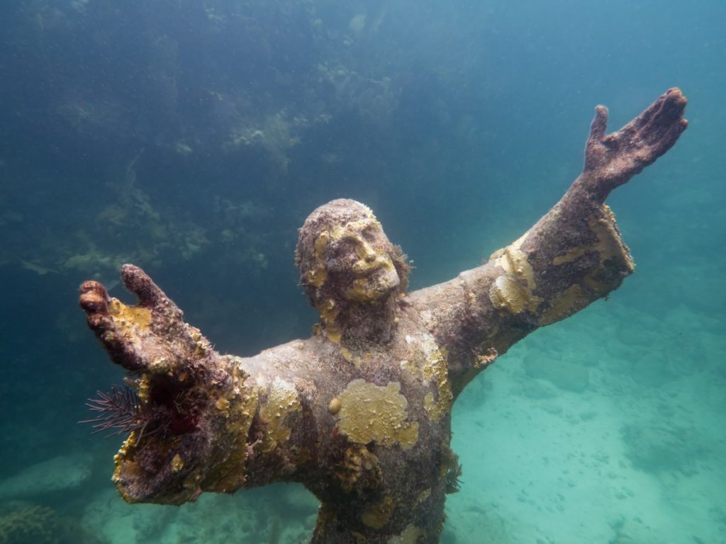 Nelle profondità della baia di San Fruttuoso, per la precisione a 17 metri, una statua di bronzo con le braccia rivolte al cielo accoglie subacquei e pesci. Si chiama Cristo degli Abissi e rappresenta un luogo di culto senza soffitti (se non la superficie del mare). La luce, filtrata dalla colonna d’acqua, altera i colori e le proporzioni, rendendo l’incontro con il gigante un’epifania mistica e silenziosa in un ambiente alieno all’uomo.