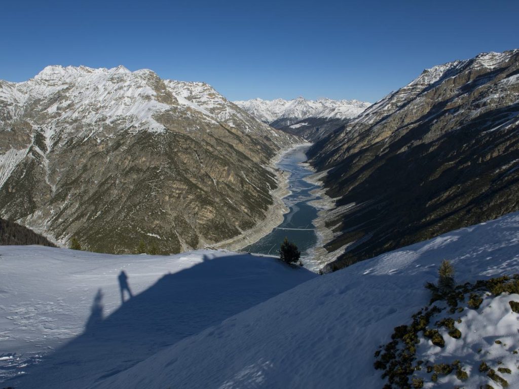 Il paesaggio dell’Alta Valtellina è un’alternanza scenografica di ampie vallate ricoperte da un manto bianco scintillante e laghi alpini imprigionati sotto lastre di cristallo trasparente. Le cime granitiche si fanno spazio sopra foreste di larici spogli, mentre il vapore delle sorgenti termali naturali sfida il gelo circostante.