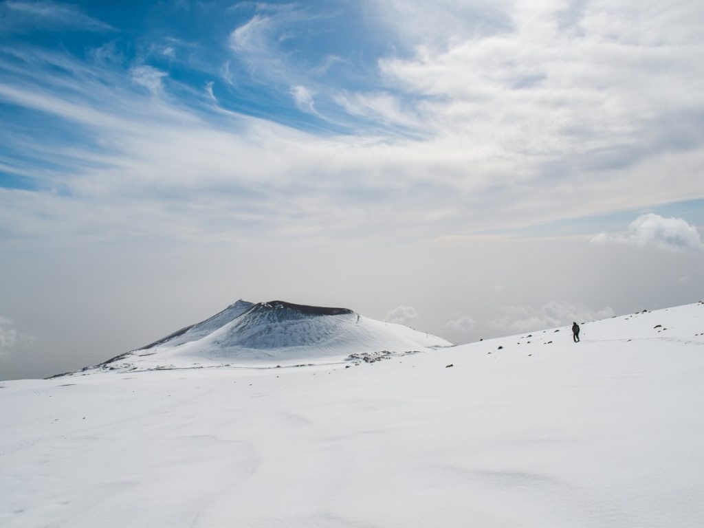 Sui versanti del vulcano più alto d’Europa, la stagione del freddo mette in scena uno dei contrasti cromatici più violenti del pianeta: il nero assoluto della roccia lavica che emerge prepotente tra le dune di neve candida. Il paesaggio, tra le altre cose, è punteggiato da bocche vulcaniche e grotte di scorrimento lavico in cui l’umidità perenne crea stalattiti di ghiaccio che brillano nel buio delle cavità ignee. È un mondo sospeso tra il fuoco del magma sotterraneo e il gelo dei crinali (con vista mare).