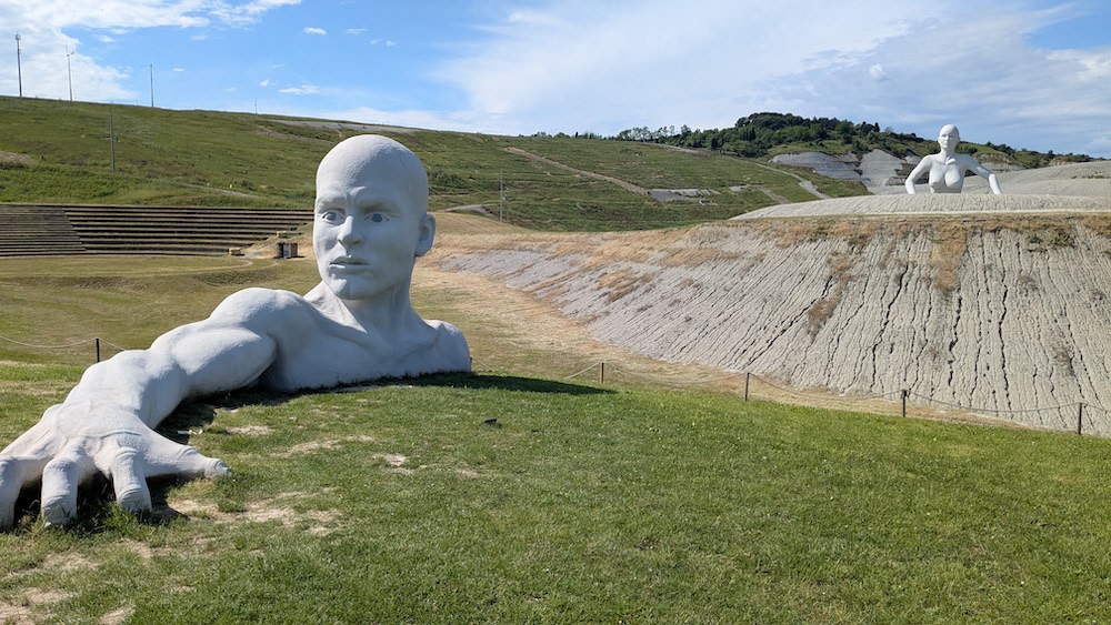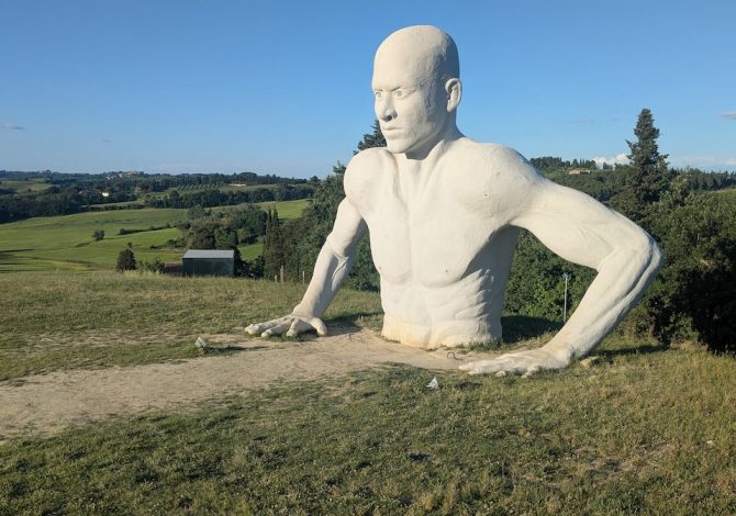 Chi arriva si accorge subito che il paesaggio non è solo naturale. È una combinazione di colline, vigneti e interventi artistici disseminati con cura. Nel Triangolo Verde, l’area che ospita gli impianti della discarica, si passeggia tra i colori di David Tremlett, i disegni di Staino e soprattutto le celebri Presenze, i giganti bianchi in vetroresina ormai diventati simbolo del borgo. Ti guardano, ti scrutano, ti fanno pensare.