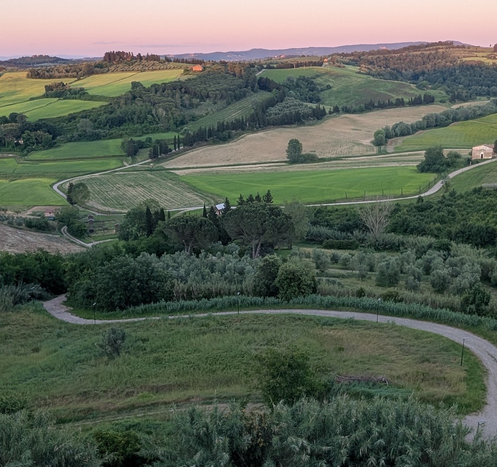 Il Palazzo Senza Tempo, restaurato da Mario Cucinella, è una terrazza sulla Valdera che ogni sera accoglie tramonti carichi di rosa e arancio.