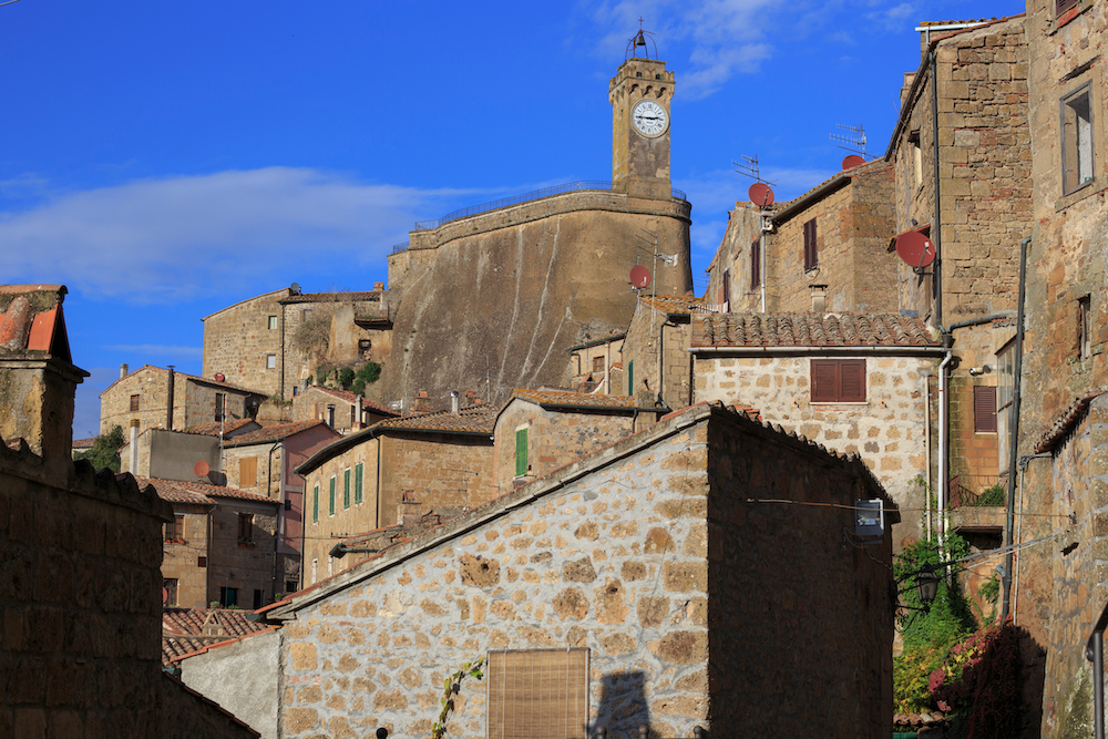 Arrivando da sud, Pitigliano si staglia come un presepe di case e torri scolpite nel tufo. Il primo colpo d’occhio è l’acquedotto mediceo (1636-1639): quindici arcate, due delle quali monumentali, che portavano l’acqua dalle sorgenti del Meleta fino alle cisterne cittadine.