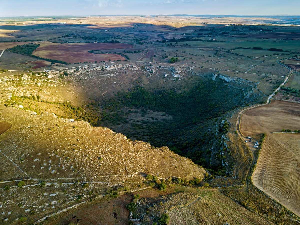 Sì, avete capito bene: è un enorme buco naturale nel terreno. Sebbene la forma perfetta possa ricordare un cratere vulcanico, la genesi del sito risiede nell’azione millenaria delle piogge sulle rocce calcaree. Con una profondità di 90 metri e un diametro superiore ai 700 metri, questa dolina di crollo costituisce un geosito di rilevanza internazionale.