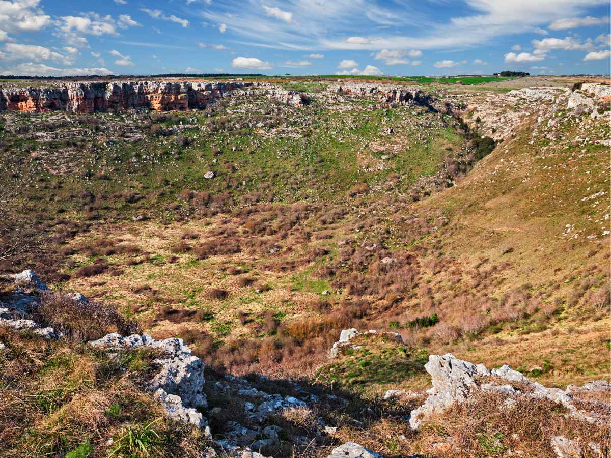 Vi basti pensare che l’altopiano pugliese custodisce una voragine imponente che interrompe bruscamente la linearità dell’orizzonte. Si chiama Pulo di Altamura ed è una vera e propria depressione circolare che rappresenta la massima espressione del carsismo epigeo del Mezzogiorno, un fenomeno naturale generato dallo sprofondamento di antiche cavità sotterranee.