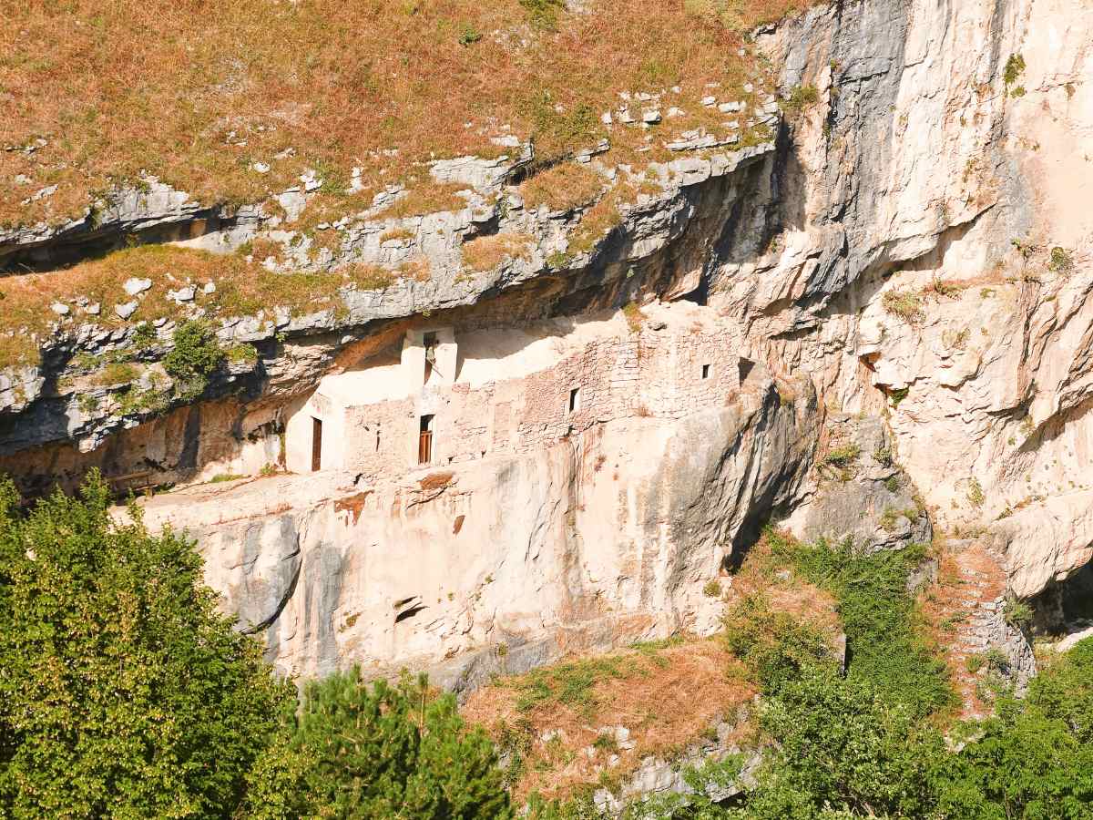 Se il primo stupisce per la maestosità, questo toglie il fiato per la sua posizione acrobatica: l’Eremo di San Bartolomeo in Legio si trova letteralmente sospeso su una balconata naturale che si affaccia sul vallone sottostante. Per entrarvi bisogna attraversare una galleria plasmata nella pietra.
