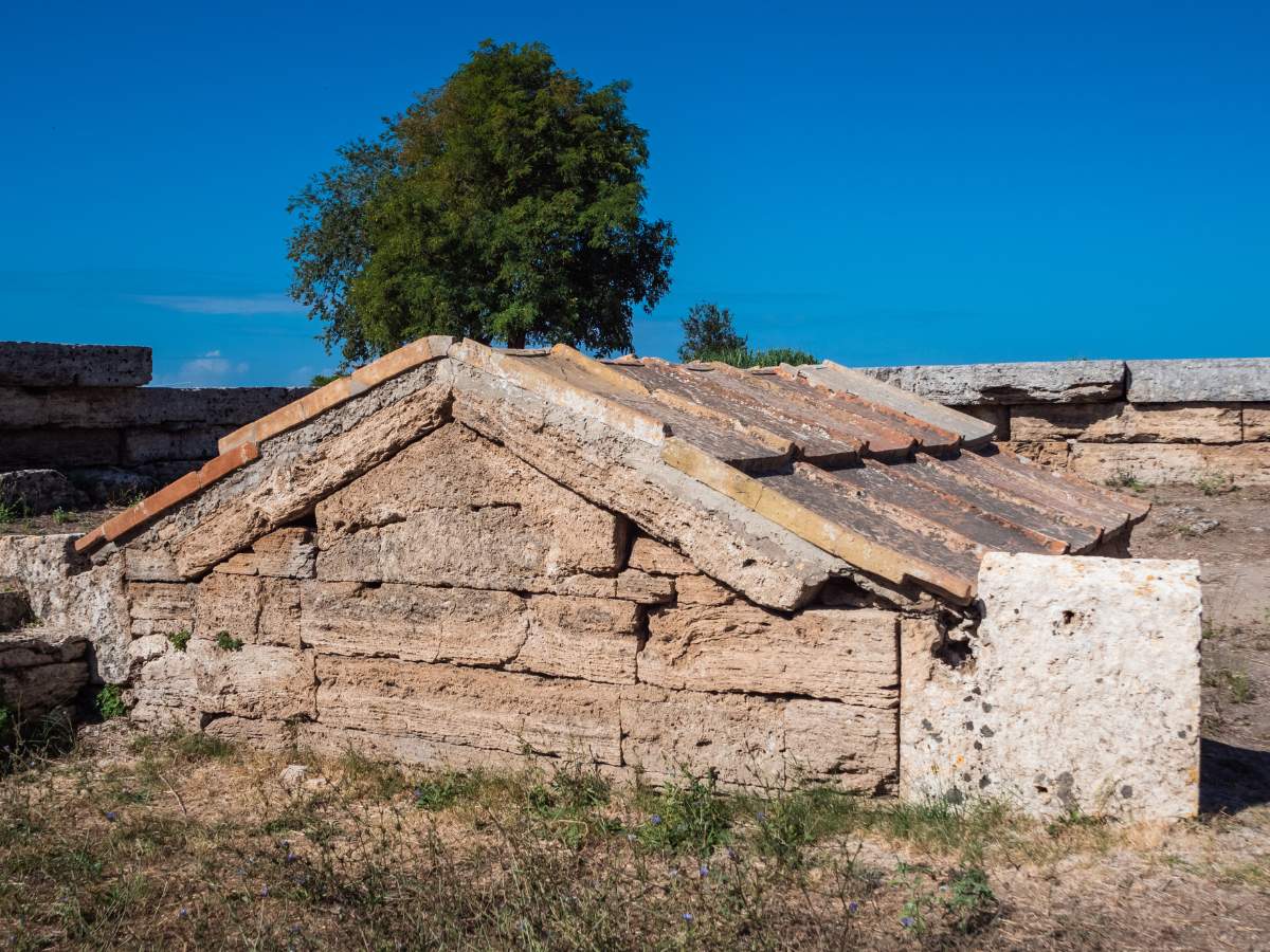 Grandi lastre di pietra poggiano l’una contro l’altra seguendo un’inclinazione che favoriva il deflusso delle acque piovane nel terreno circostante. Originariamente, sopra queste pietre poggiavano tegole di terracotta che completavano l’illusione di una dimora domestica sprofondata. Tale scelta visiva serviva a identificare il sito come la residenza eterna di un inquilino invisibile ma fondamentale per l’identità cittadina.